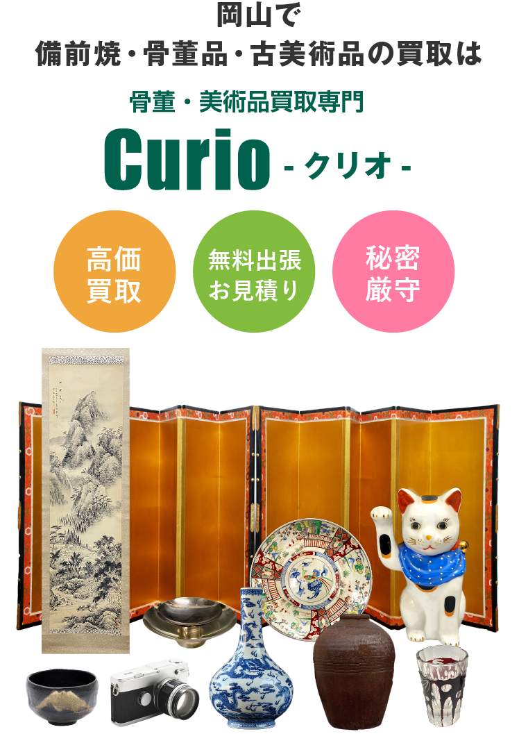 岡山市南区にて「骨董品・美術品買取専門-クリオ-」では古美術品・茶道具・備前焼・掛軸・刀・屏風・時計などさまざまな品物を買取致します。