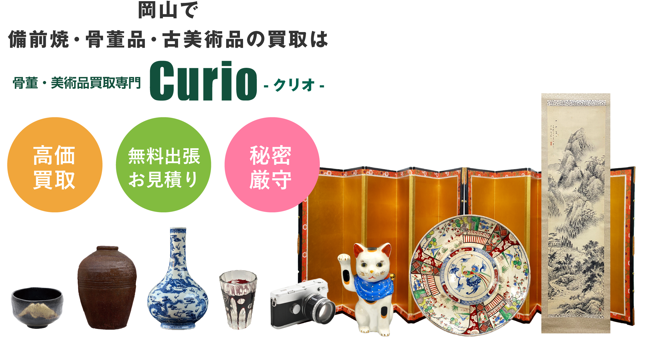 岡山市南区にて「骨董品・美術品買取専門-クリオ-」では古美術品・茶道具・備前焼・掛軸・刀・屏風・時計などさまざまな品物を買取致します。